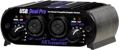 USB Dual Pre jest wysokiej jakości przenośnym podwójnym przedwzmacniaczem z interfejsem USB umieszczonym w kompaktowej obudowie. USB Dual Pre został zaprojektowany by zapewnić najwyższą jakość podczas nagrań w studio i poza nim. Oba nisko szumowe kanały posiadają wzmocnienie rzędu 48dB, oraz diody wskazujące pojawienia się sygnału i przesterowanie. Złącza wejściowe są symetryczne zrealizowane na gniazdach combo XLR i 1/4” TRS. Oba wyjścia są symetryczne, nisko impedancyjne buforowane z gniazdami 1/4”TRS. USB Dual Pre może być zasilane zewnętrznym zasilaczem 12V, baterią 9V, napięciem dostarczonym z komputera przez złącze USB, lub jakąkolwiek ich kombinacją. Używając do zasilania samej baterii z wyłączonym zasilaniem Phantom przedwzmacniacz może pracować ponad 50 godzin. Czas pracy spada do około 20 godzin przy włączonym zasilani Phantom (w zależności od użytego mikrofonu), co cały czas wystarczy do pracy podczas całej sesji. Wbudowane nisko szumowe zasilanie Phantom +48V dostępne jest na obu gniazdach niezależnie jak przedwzmacniacz jest zasilany, łącznie z zasilaniem przez złącze USB! Na tylnim panelu znajduje się złącze słuchawkowe mini Jack 1/8” TRS z regulacją głośności i miksu wejść z monitoringiem ze złącza USB. Zapewnia on pełny monitoring bez opóźnień. Monitor mix jest również wysyłany na złącza wyjściowe 1/4” TRS. Umożliwia to odsłuch na zewnętrznych monitorach. Interfejs USB jest zgodny ze specyfikacją USB 1,1. Używa on trybu adaptive mode przy odtwarzaniu i trybu asynchronicznego asynchronous mode podczas nagrywania. Przedwzmacniacz pracuje jako Urządzenie Audio USB używając sterowników wbudowanych w systemy Windows 98SE/ME/2000/XP/Vista oraz Apple OS9.1/OSX, nie wymagając żadnych dodatkowych sterowników. Kompaktowa obudowa jest wykonana z anodowanego aluminium z gumowymi bokami, w surowym stylu. USB Dual Pre zapewni lata bezproblemowej pracy zachowując wysoką jakość dźwięku a dodatkowo przez różnorodność opcji zasilania, USB Dual Pre znajdzie szerokie zastosowanie w radiu, studiu czy nagraniach plenerowych.