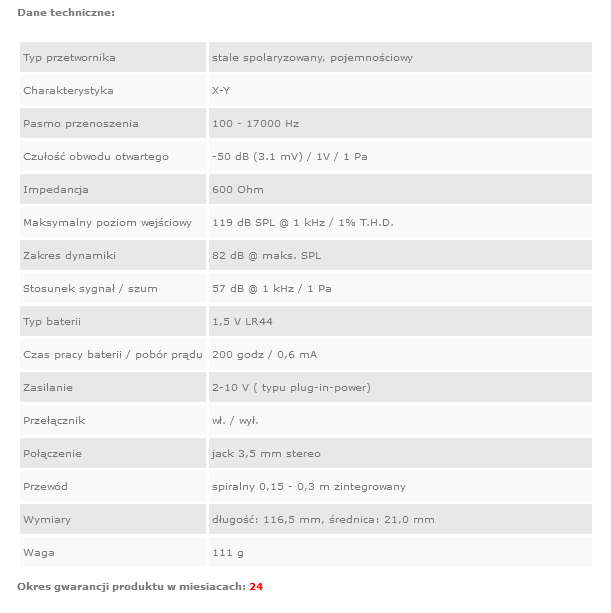 • Maksymalny poziom wejściowy: 119 db SPL, 1 kHz przy zniekształceniach harmonicznych 1 %