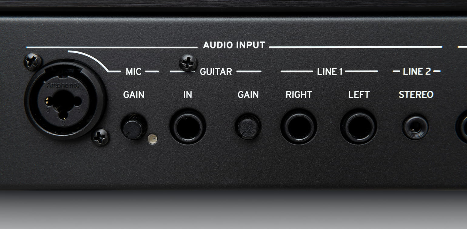 - Guitar: Mono z kontrolą Gain (1/4" jack)