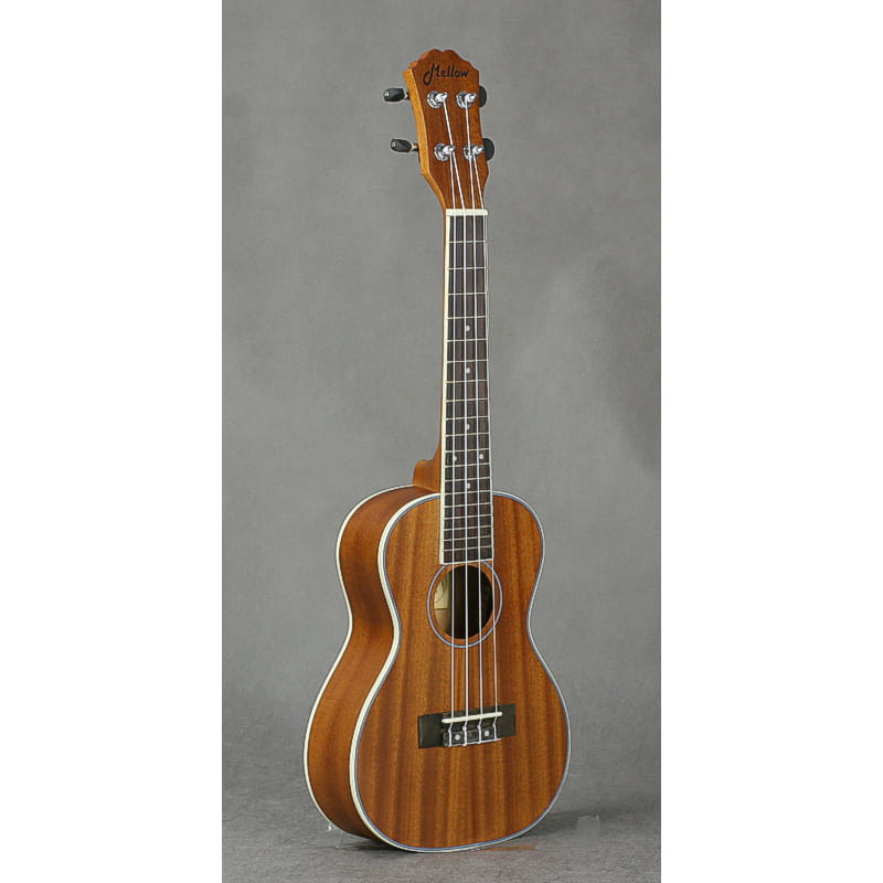 Mellow UKCB MH to koncertowe ukulele wykonane w całości z drewna – w tym wypadku jest to mahoń sapele. Brzmieniowo instrument ma ciepłe, typowo „hawajskie” brzmienie, z soczystym basem i nieco przyciętą „górą”. Mahoń daje też najbardziej aksamitny, miękki ton, mniej agresywny, chociaż oczywiście mówimy tu o niewielkich różnicach. Wykończenie jest bardzo dobre, instrument powala prezencją – ma podwójny binding, zrobiony jest bez połysku, w eleganckiej satynie. Już po pierwszym wzięciu do ręki widać, że to normalny instrument, wykonany porządnie i należycie