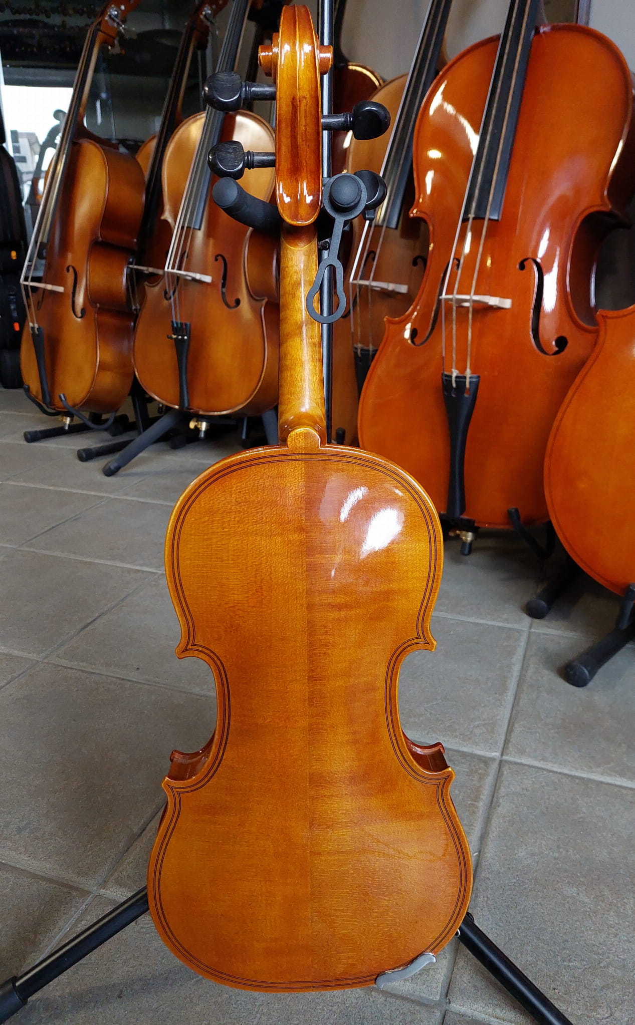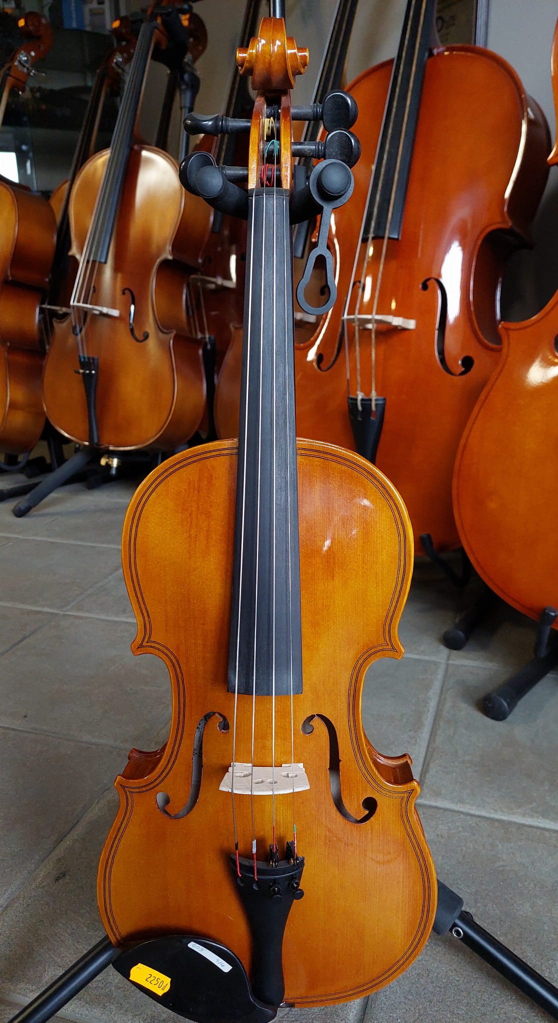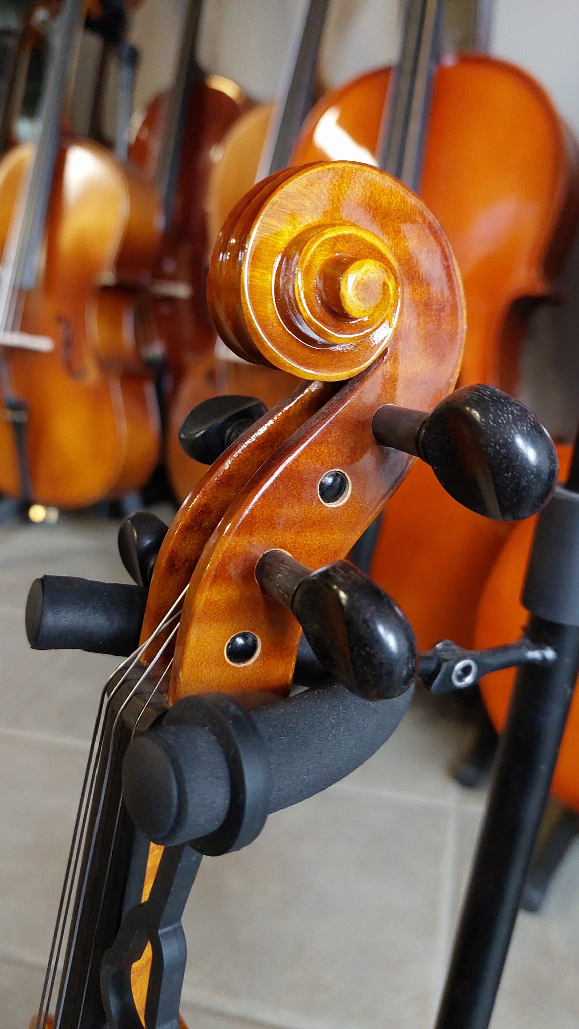 - Skrzypce mają założony strunociąg z czterema czarnymi mikrostroikami.