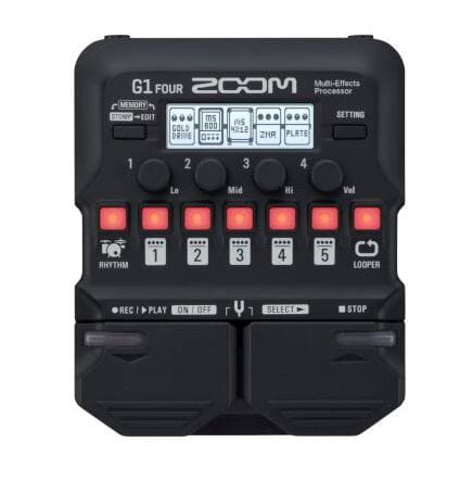 Multiefekt gitarowy Zoom G1 FOUR oferuje ponad 70 efektów i modeli wzmacniaczy, looper i automat perkusyjny oraz dostęp do dodatkowej biblioteki efektów Guitar Lab do pobrania.